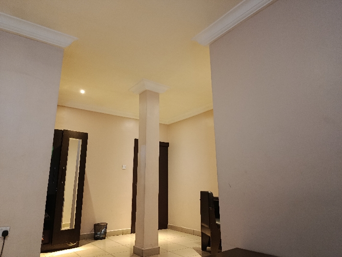 The scene depicts an interior space, described as being in Barden Yana, Nigeria, characterized by light-colored walls, ceiling, and tiled floor. The walls are a light beige, featuring white crown molding where they meet the ceiling, which is also a light beige and includes at least one recessed spotlight. A central, square, light-colored structural pillar with white molding at its top extends from the floor to the ceiling. On the left side, a dark brown door with a vertical mirror panel is partially open. Nearby, a black wire mesh waste bin rests on the floor. A black power outlet is visible on the lower section of the wall to the far left. Further into the room, past the central pillar, another dark brown door is visible, and a white light switch or thermostat is mounted on the wall. A dark brown furniture piece, possibly a bench or chair, is partially visible on the far right. No individuals or specific actions are depicted.