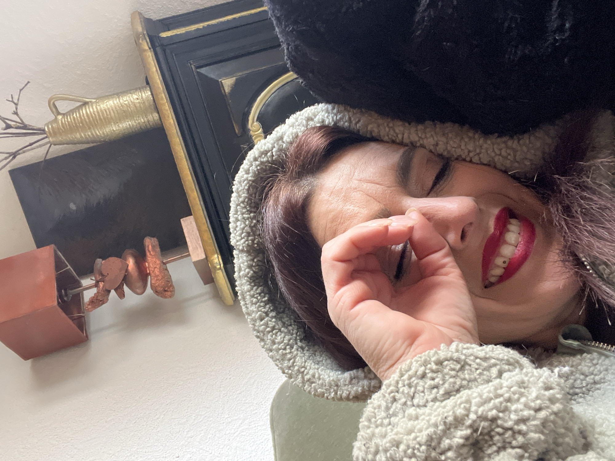 A close-up, tilted selfie shows a woman with auburn hair and red lipstick, wearing a fuzzy gray hooded jacket and a black hat. She has one eye closed and her hand partially covers her face in a gesture. In the background, mounted on a white wall, are several decorative items: a black-framed rectangular object, a golden vase-like object with twig-like protrusions, and a copper-colored abstract sculpture. The location is Konz, Germany.