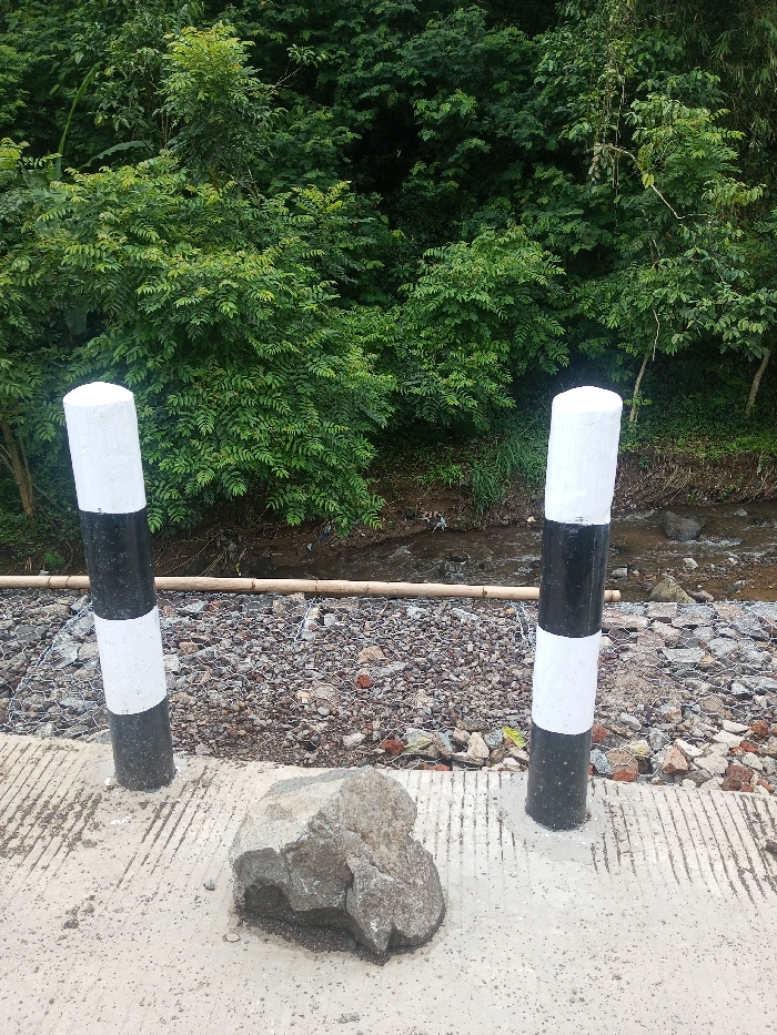 The image displays an outdoor scene in Sarwahi Mal., India, showing a section of concrete surface bordering a natural area. In the foreground, a large, irregularly shaped gray rock rests on a light gray concrete slab, which features parallel grooves on its right side. Two concrete bollards, each painted with alternating white and black horizontal stripes, are vertically embedded in the concrete, positioned with open space between them. Directly behind the bollards, a sloping embankment is visible, covered with loose rocks, debris, and sections of hexagonal wire mesh, indicative of erosion control. A horizontal line of light-colored poles or bamboo sticks spans the midground above this embankment. Further back, a narrow stream with visible water and a rocky bed flows horizontally across the scene. The background is dominated by dense, green foliage from numerous trees and shrubs. No people or specific actions are depicted.