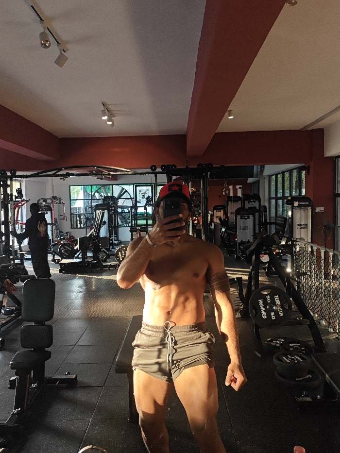 The scene depicts the interior of a fitness gym located in the Chongqing High-tech Zone, China. In the foreground, a shirtless male subject, wearing dark grey athletic shorts and a red baseball cap with a black star emblem, is positioned, holding a smartphone to obscure his face in what appears to be a mirror selfie. He exhibits visible muscular definition, wears a light-colored wristband on his left wrist, and a patterned tattoo on his left bicep. Strong natural light from large windows on the right illuminates the subject and floor, creating distinct shadows. The gym floor is composed of dark, textured rubberized tiles. Various black gym equipment is visible in the mid-ground and background, including an adjustable utility bench on the left, weight racks, and resistance machines. Stacked weight plates, some marked "HAMMER STRENGTH," are present near a machine on the right. In the reflected background on the left, another individual in dark attire is partially visible, standing near gym equipment. The ceiling is white with exposed reddish-brown structural beams and white track lighting fixtures. Large, multi-pane windows line the right side of the facility, revealing outdoor foliage.