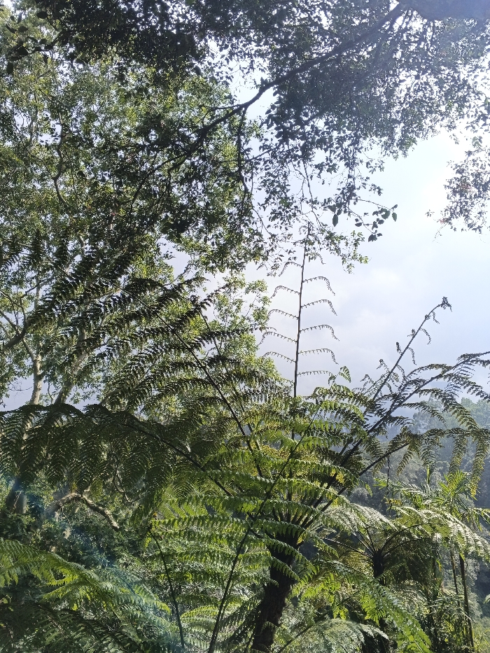 Lush greenery dominates the frame, featuring fern trees with intricate leaf patterns in the foreground. Sunlight filters through the upper canopy of broadleaf trees, casting dappled light. A tall, slender fern stalk rises vertically. A distant, hilly landscape, blanketed in green, is visible through the trees. The sky is a pale blue-grey, partially obscured by the dense foliage.