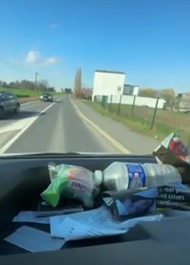 The video is taken from the dashboard of a vehicle moving along a paved road on a sunny day. The sky is a clear blue. Visible on the dashboard are a water bottle, a package of Daunat sandwiches, cigarette packaging, and some papers. Outside, the road is lined with grass and a white building with a white fence is visible on the right. Cars can be seen in the distance on the road ahead.