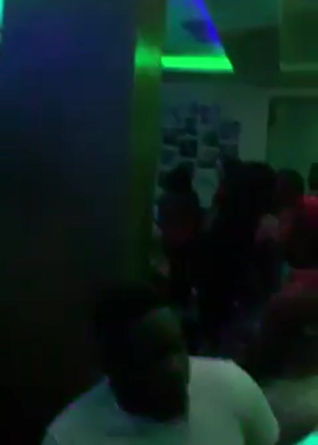 dark room with several people in it. The room is lit with colored lights, including green, purple, and blue. The people are all silhouetted, but it appears that most of them are wearing light-colored shirts. There is a pillar in the middle of the room. It is difficult to tell what the people are doing, but it appears they are standing around and talking. A song with a heavy bassline plays.