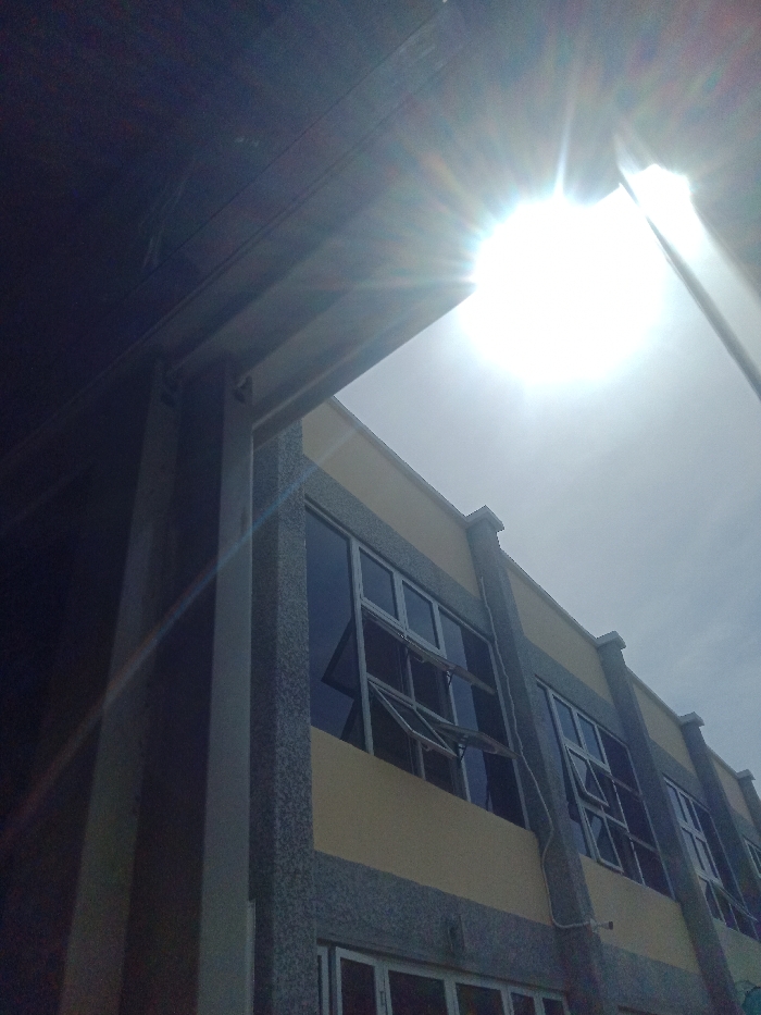 The image depicts an upward-angled view of a building exterior in Tarauni, Nigeria, under direct sunlight