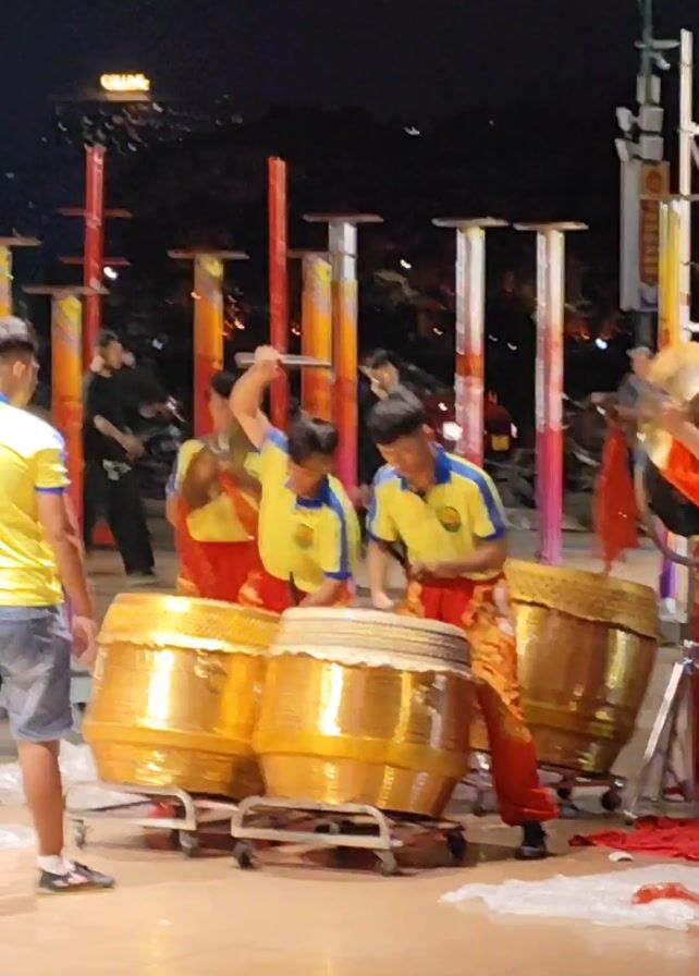 The video captures a lively performance featuring a group of young men playing traditional instruments outdoors at night. Three of them are drumming on large, golden drums mounted on wheeled carts, while another one plays a cymbal. They are all dressed in matching yellow shirts with blue trim and red pants with intricate patterns. The drums take center stage, reflecting the bright overhead lighting. Behind the performers, there are several tall, colorful poles with square platforms on top. In the background, buildings and people can be seen, adding depth to the scene. The event appears to be well-lit, with a stage-like area where the performance is taking place. Overall, the video highlights the vibrant energy of a cultural performance.