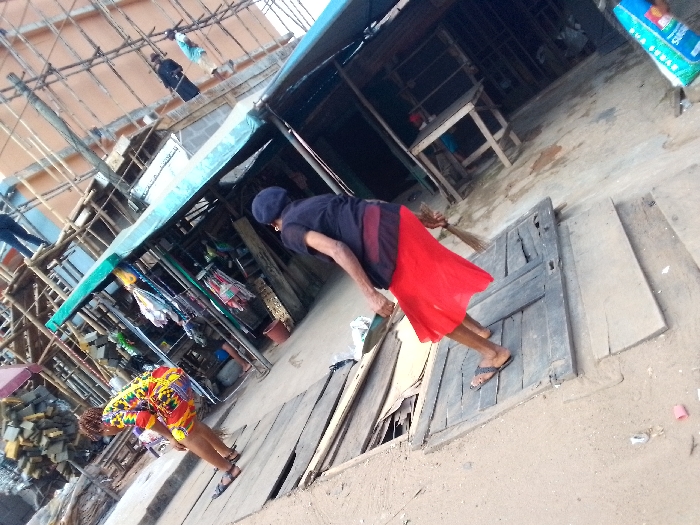 This image captures an outdoor street or market scene in Nkpor, Nigeria. In the foreground, two individuals are present. On the right, an individual wearing a dark blue top, a red skirt, and a dark beret stands on wooden planks, holding a traditional broom composed of bundled sticks in the right hand. This person faces towards the left, with the body slightly bent forward. To the left, a second individual, dressed in a brightly patterned multi-colored garment, is significantly bent over, facing downwards towards the ground, also standing on wooden planks. Both individuals are wearing dark sandals. The environment includes two visible market stalls or shelters. The nearest stall, positioned behind the individuals, features a light blue tarp awning and displays various clothing items. A red bucket is visible beneath this stall. Further into the background, another stall structure with a visible wooden table inside is present. Extensive, multi-level wooden scaffolding, indicative of construction or renovation, dominates the background, with several indistinct figures visible on its elevated platforms. The ground is an uneven mix of dirt and concrete, with additional loose wooden planks, one appearing to be an old door, covering sections of the surface. A pile of concrete blocks or similar building materials is visible on the far left. A blue and white bag, possibly a sack, is partially visible in the upper right portion of the frame.