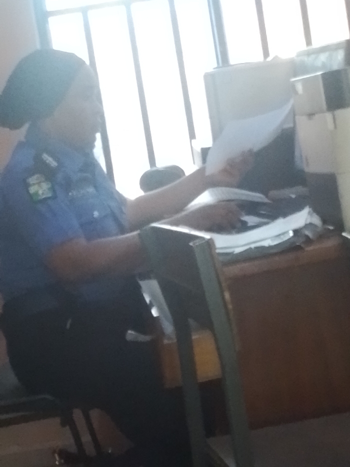 The scene depicts an indoor office in Kabala, Nigeria. A uniformed female individual is seated at a wooden desk, facing towards the left of the frame. She wears a light blue short-sleeved shirt with a green and white emblem, consistent with the Nigerian Police Force, on her left shoulder, dark trousers, and a dark head covering. Her right hand holds a single white sheet of paper, extended forward, while her left hand rests on a substantial stack of documents on the desk. To the right on the desk, several light-colored boxes or containers are stacked. A dark chair is partially visible in the immediate foreground, obscuring the lower portion of the desk and the individual's legs. The background is dominated by a large, brightly illuminated window with vertical security bars, creating significant backlighting.