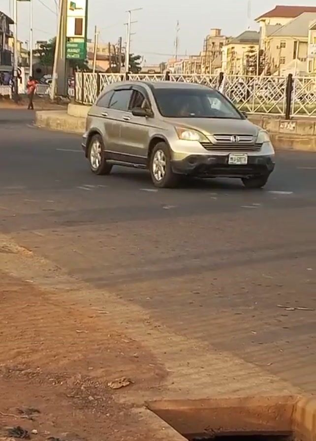The camera shows a busy street in what looks like an African city. In the background there are buildings and traffic lights. A gold-colored Honda CRV drives past, then a yellow tuk-tuk and a motorcyclist riding a white motorcycle. A man in a blue shirt is walking past in the foreground. He is carrying a bottle of water. The road surface is rough and there is a drainage ditch in the foreground.