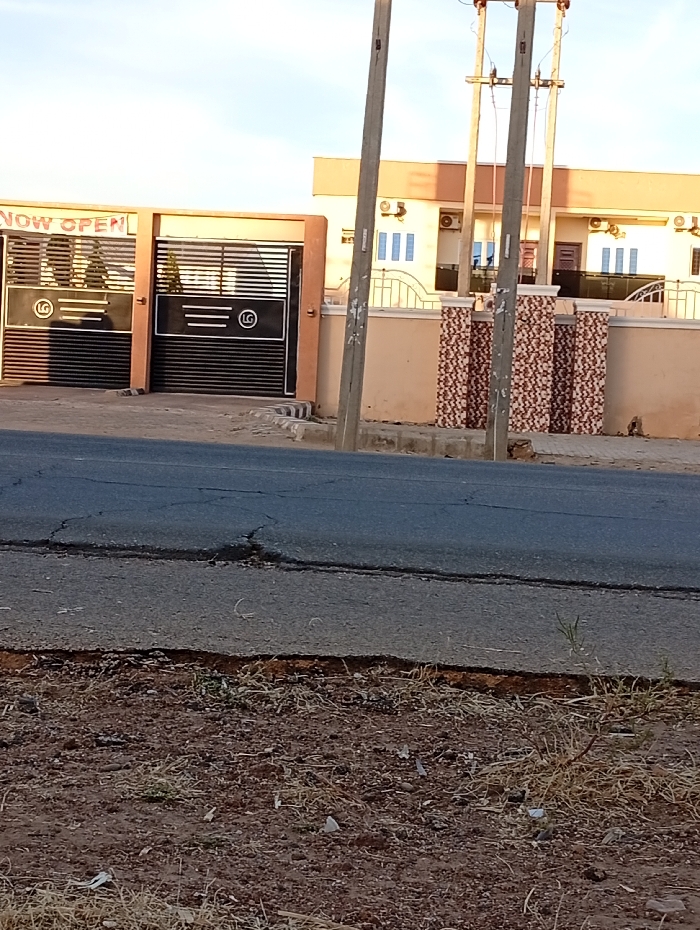 A low-angle shot shows a street leading to a building with a "Now Open" sign. The building has black gates with white "LG" logos, decorative pillars, and a tan facade. Air conditioning units are visible on the exterior. Utility poles obstruct the view of the building's upper portion. A cracked asphalt road divides the foreground, which consists of dirt, sparse vegetation, and scattered trash. The sky is light blue.