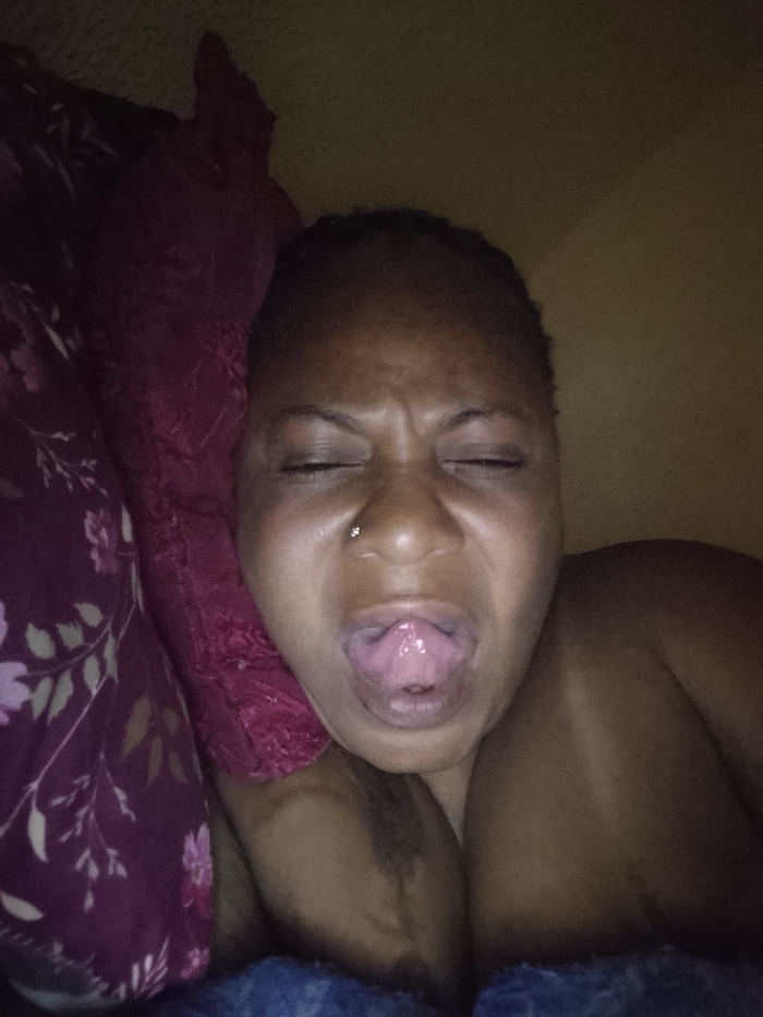 A close-up image features a person with dark skin lying in bed. Their eyes are closed, and their mouth is open with their tongue extended. A nose ring is visible on their left nostril. To the left is a dark red pillow with a floral pattern. The background is a muted yellow. A blue textured blanket is visible near the bottom of the frame.