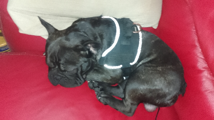 A black French Bulldog wearing a reflective harness is curled up asleep on a red couch