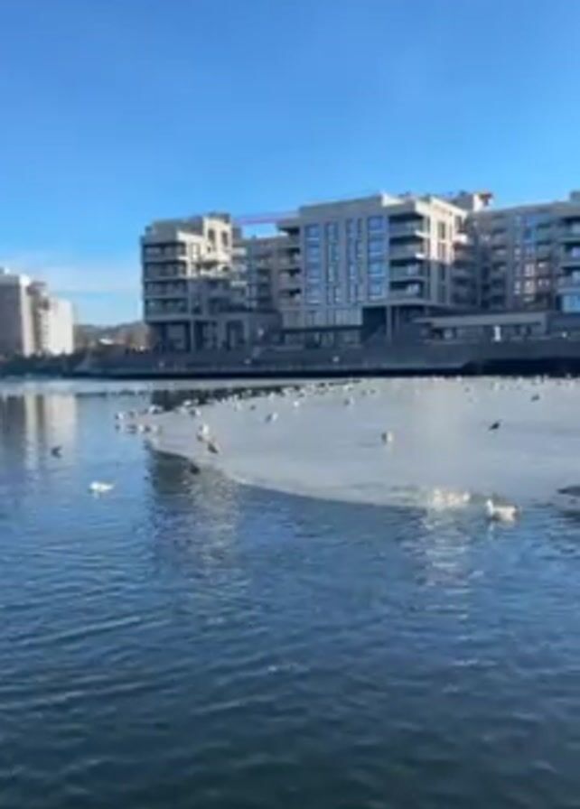 scene of a waterway where part of the water surface is covered with ice. On top of the ice, a large group of seagulls is resting. The water surrounding the ice is dark blue, and there are ripples on the surface. In the background, there is a large building with several floors and many windows, and a construction crane is visible. The sky above is clear and bright blue.
