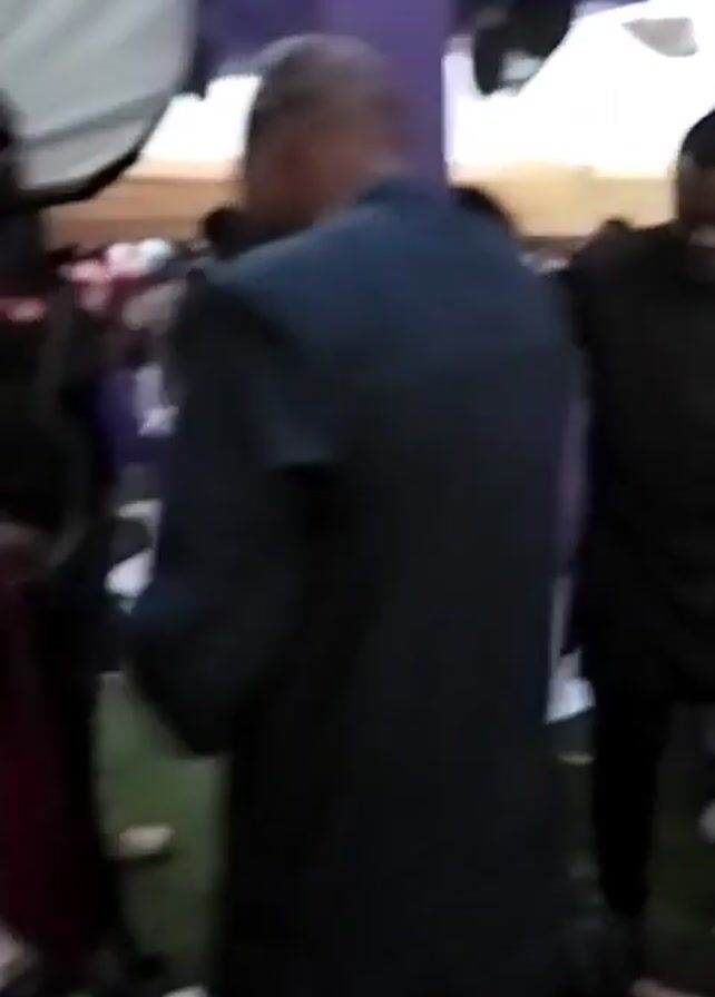 scene indoors, possibly at an event. Several people are present, including one in a maroon robe and cap, holding a staff. There are also individuals dressed in black and a woman in a long purple dress. People appear to be handing out white items, possibly money or tickets. The background includes purple pillars and a white floor. The overall impression is a gathering with possible ceremonial or celebratory aspects. The video is a bit shaky and the view is partially obstructed by people in the foreground.