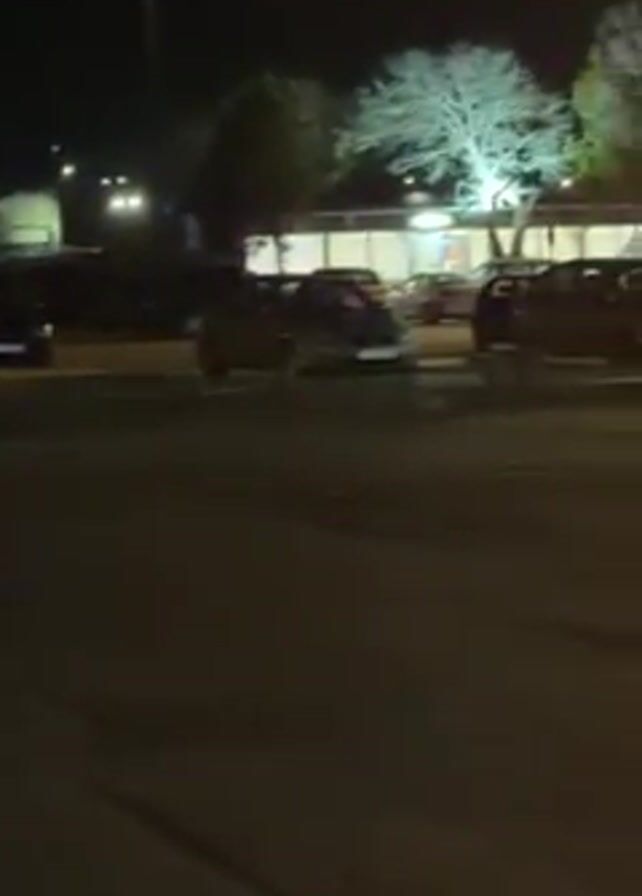 nighttime scene in a parking lot or street with parked cars. The camera is held by someone standing nearby, as indicated by the partially visible person in a patterned jacket at the beginning. The camera pans slowly to the right, focusing on a row of cars parked along the edge of a building. The building has illuminated windows, and figures can be seen moving inside. The overall lighting is dim, and the focus is slightly soft.