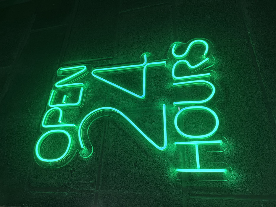 A neon sign glows green against a textured, dark-green brick wall