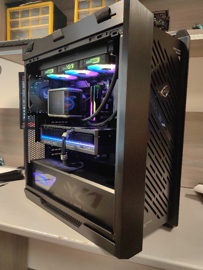 - "A dark-colored ASUS ROG Strix Helios desktop computer tower, with a partially open side panel, is displayed at an angle, showcasing its internally illuminated components" by FM-FDa2v2, licensed under CC BY 4.0