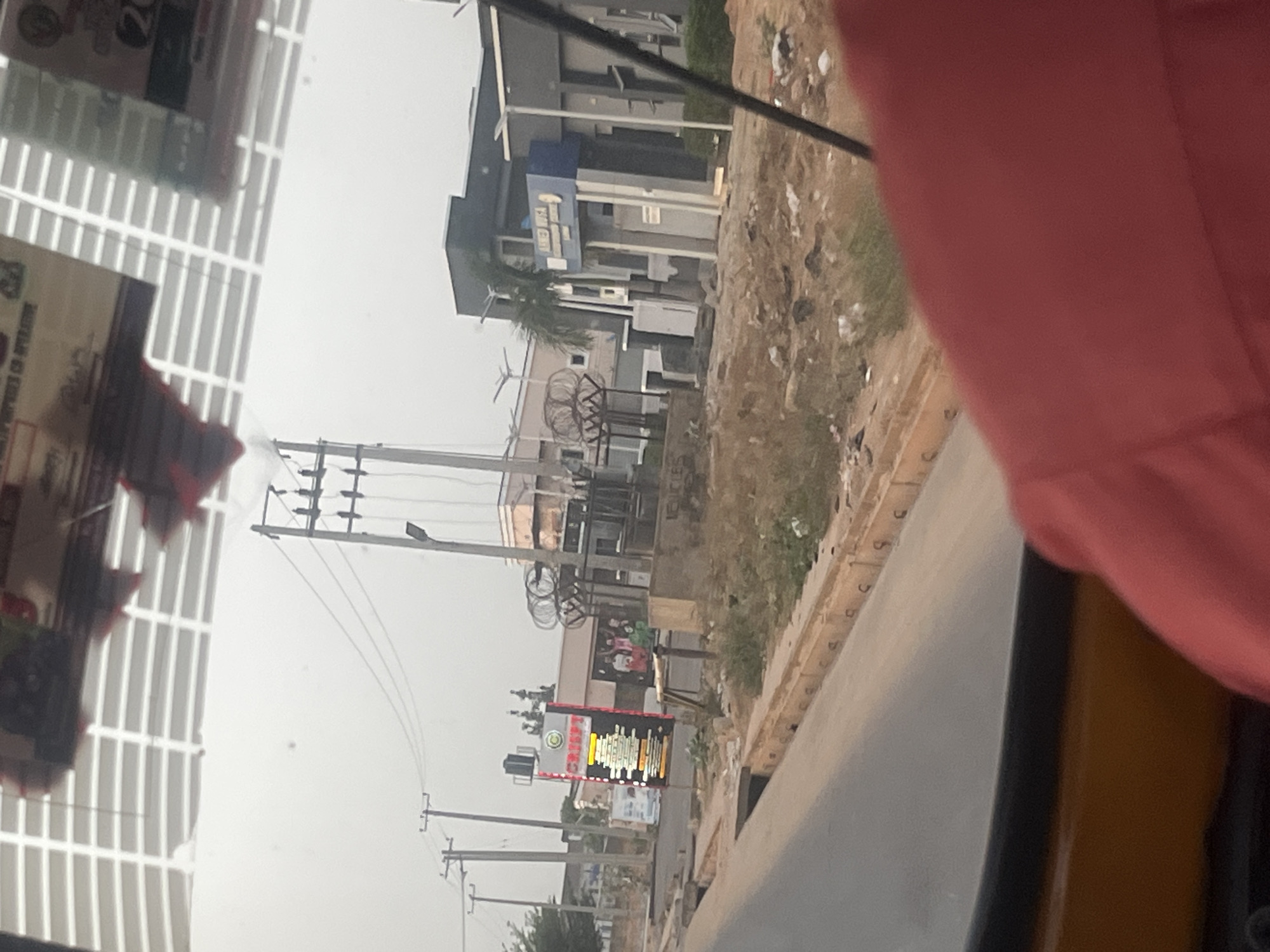 The image, taken from inside a vehicle, shows a street scene in Rido, Nigeria. Outside the vehicle, power lines run along the side of the road. Several commercial buildings are visible, including a bank. There are billboards and signage, including one with yellow writing. The landscape is dusty with some vegetation. A person wearing a pink shirt is partially visible in the right side of the frame. The day appears overcast.