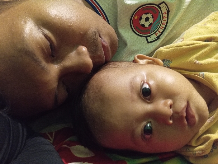 An overhead, close-up photograph depicts an adult and an infant positioned in close proximity, likely on a bed or soft surface in Kecamatan Pati, Indonesia