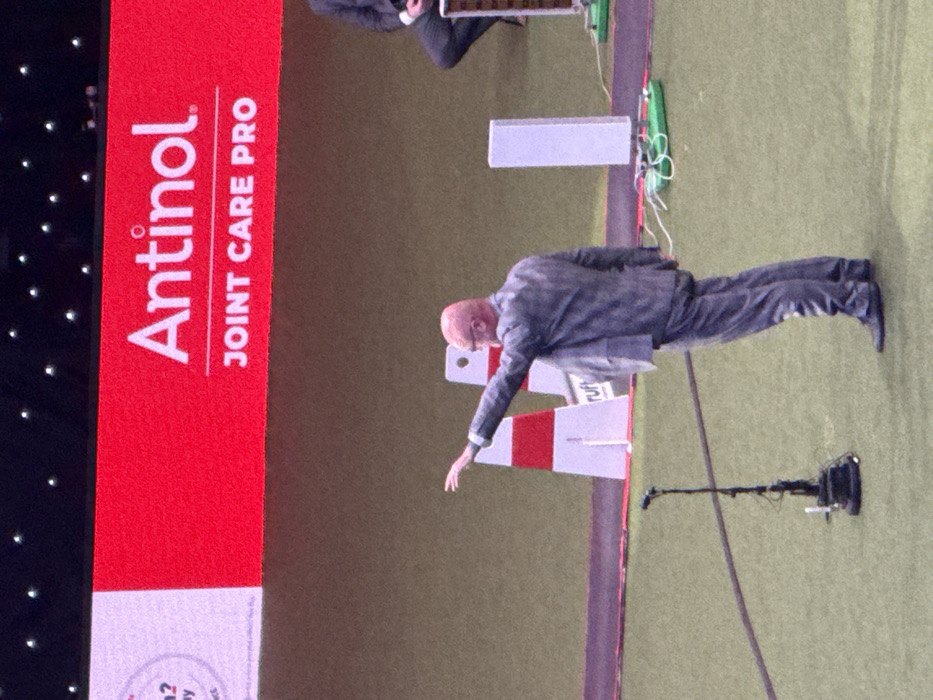 An indoor arena scene on an artificial grass surface, likely at the National Exhibition Centre (NEC) in Marston Green, Metropolitan Borough of Solihull, United Kingdom. A bald man with a beard and glasses, wearing a grey suit, stands with his back to the viewer, extending his right arm forward and slightly upward in a gesture. A black microphone stand with a circular base is positioned on the grass in the foreground. The background features a large LED screen displaying "Antinol. JOINT CARE PRO" on a prominent red panel. To the left of this, a white panel with partial text and a circular graphic is visible. White and red striped pylons, one partially displaying "Crufts," are situated further back on the grass. To the right of the gesturing man, a white rectangular column and green equipment bases with associated cabling are present. A second individual, wearing a dark suit, is partially visible seated on the far right edge of the frame.