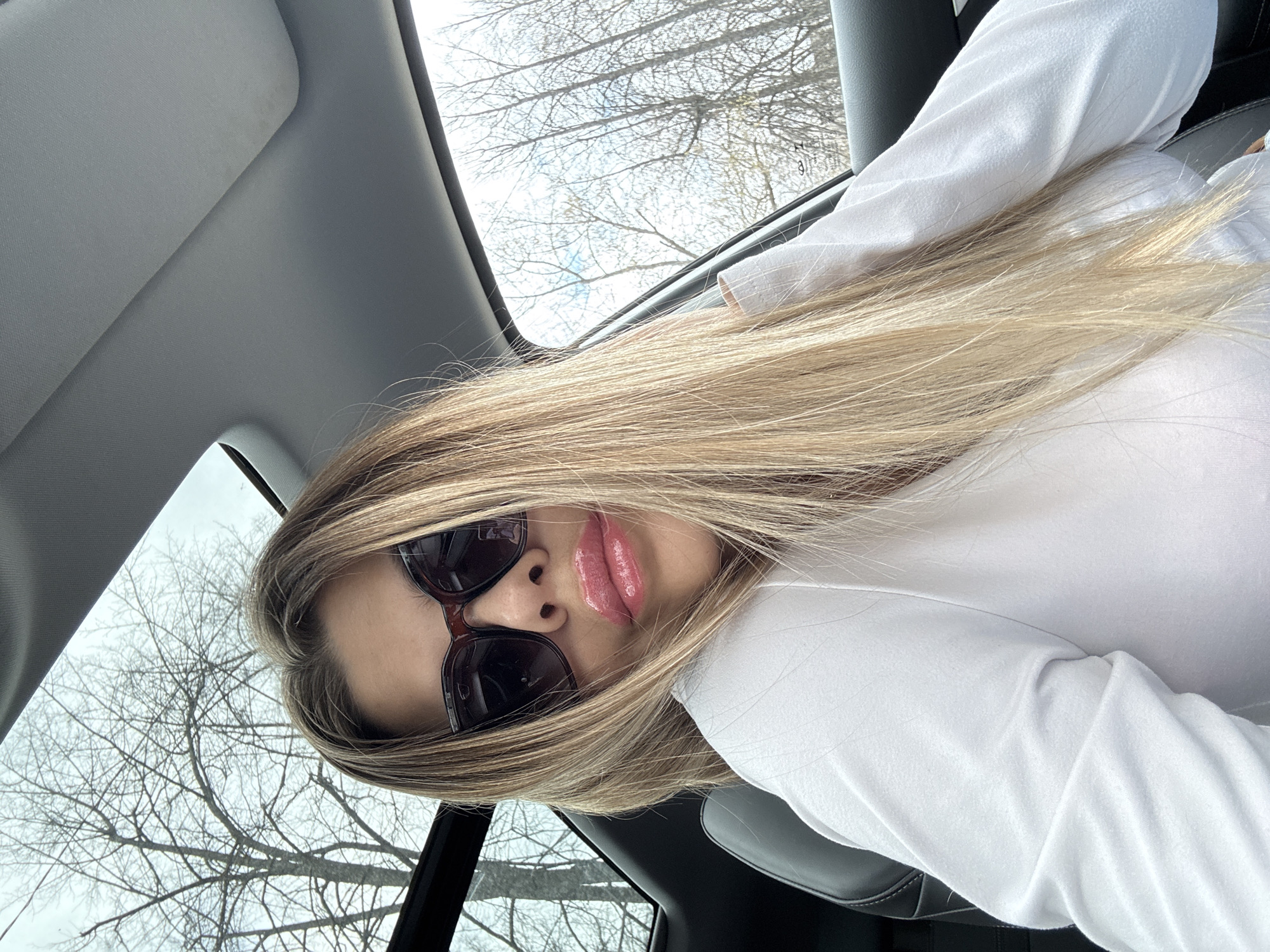 A photograph taken from inside a car shows a woman with blond hair wearing sunglasses and a white top. The view through the car window reveals a landscape with bare trees, suggesting a possible location in Chaikovsky, Russia, given the prevalence of such scenery in that region during certain times of the year.
