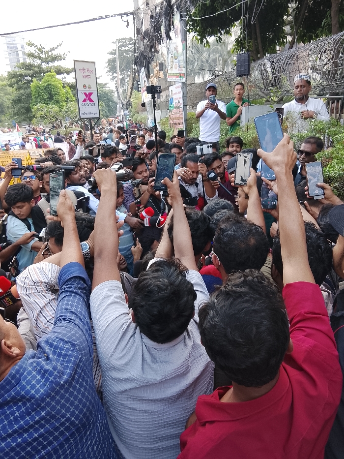 The image captures a dense daytime street scene in an urban area of Dhaka, Bangladesh, indicative of a public gathering or media event