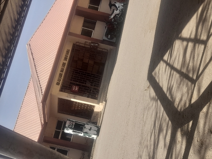 The image displays a daylight scene in Dabawa, Nigeria, featuring a single-story building with a light tan facade and a multi-gabled reddish-brown corrugated metal roof