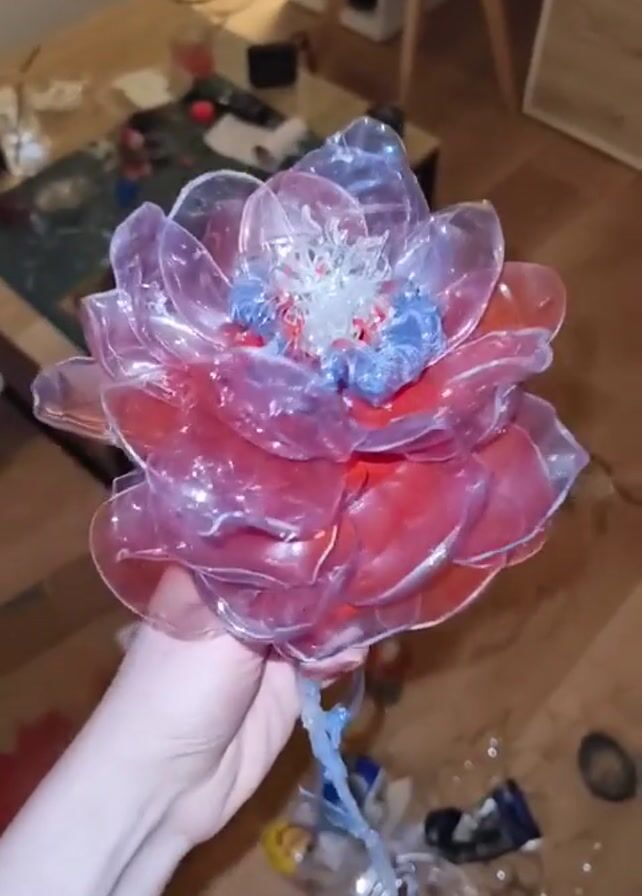 A hand holds a large, translucent red and blue flower made from what appears to be plastic bottles