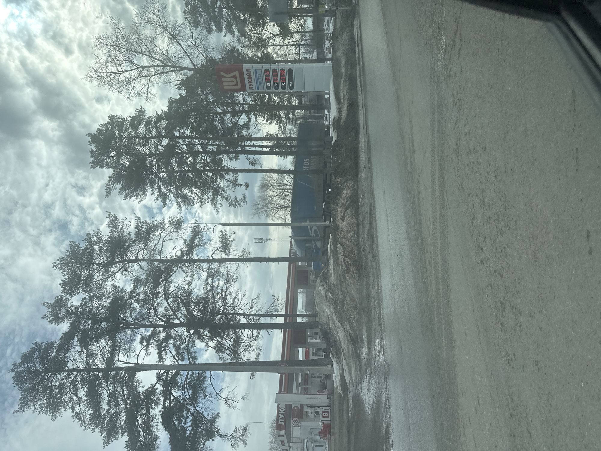 The scene depicts a Lukoil gas station in Chaikovsky, Russia, viewed from a road on a cloudy day. The foreground shows wet, dark asphalt road surface. Between the road and the gas station are several irregular mounds of dirty, melting snow and slush. In the midground, a red and white Lukoil gas station canopy is visible to the left, with multiple fuel pumps underneath. Behind the pumps is a white building. To the right of the station, a tall, illuminated Lukoil price sign displays "ЛУКОЙЛ" at the top, followed by fuel types and prices: "ЭКТО", "ДТ 79.32", "95 69.01", "92 63.58", and "100" with an empty price slot. A blue semi-trailer truck, partially obscured by a snow pile, bears "DFDS TRANS" branding. Numerous tall evergreen trees, primarily pines, stand throughout the image, with some bare deciduous trees also visible, all silhouetted against a largely overcast sky with scattered lighter clouds. No individuals are clearly visible.