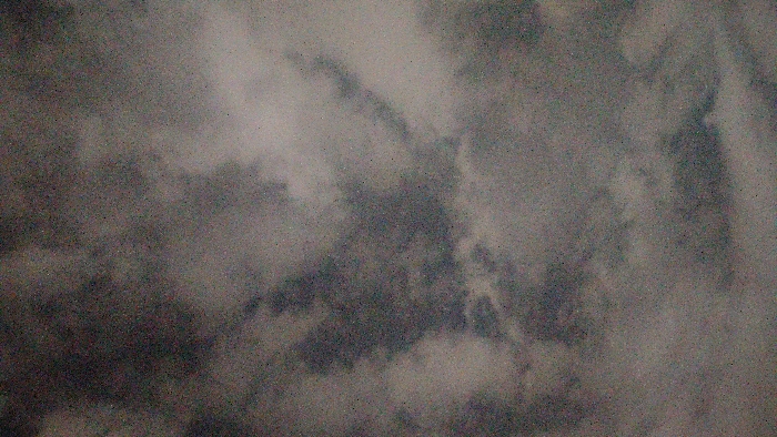 A highly pixelated and grainy, vertically oriented image displays a segment of the sky over the city of Cali, Colombia. The scene is dominated by amorphous cloud formations in varying shades of grey, ranging from dark charcoal to lighter off-white. The diffuse lighting conditions suggest either nighttime or a heavily overcast day, with brighter areas possibly indicating illumination from an unseen light source. No human figures, man-made objects, or specific actions or interactions are discernible within the frame. The environment is exclusively atmospheric.