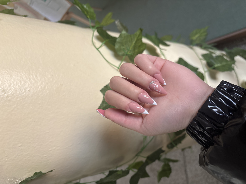 A close-up shot in Plovdiv, Bulgaria, displays a human left hand with light skin tone. The nails are long, stiletto-shaped, featuring a nude pink base with white French tips. The ring finger nail is adorned with a white outline of a heart and three small, clear rhinestones positioned horizontally near the cuticle. The lower portion of the arm is covered by a black, glossy, gathered jacket cuff. The background features a light cream-colored, textured cylindrical structure draped with green artificial ivy. A blurry, lighter interior setting is visible to the right in the deeper background.