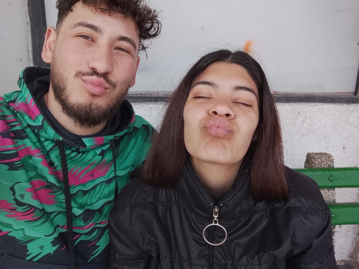 A close-up, selfie-style portrait features two individuals, a male and a female, posing in the city of Roman, Bulgaria