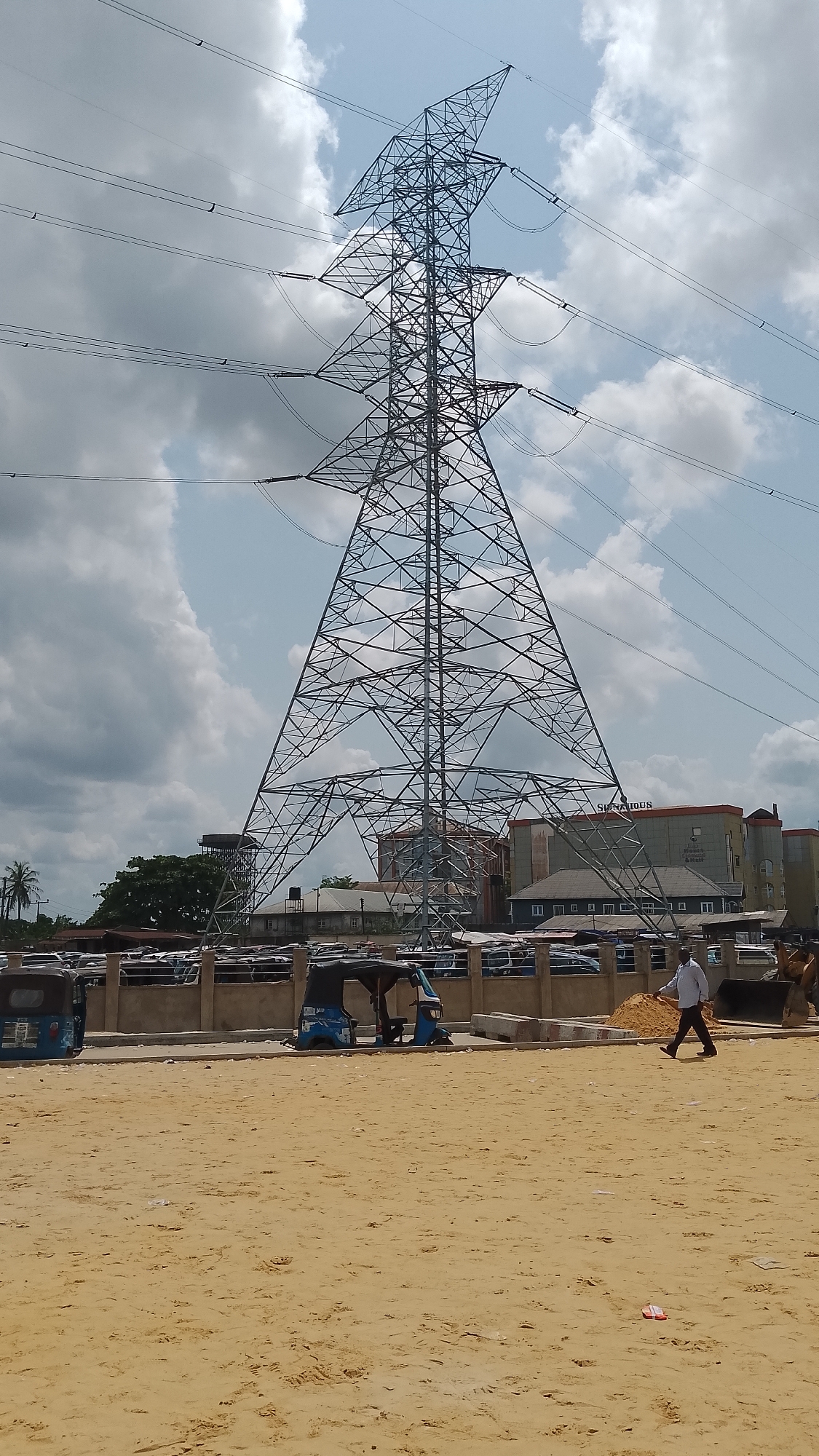 The image displays an urban environment in Effurun, Nigeria, under a sky with significant cloud cover. A large, grey lattice-steel electricity transmission tower stands prominently in the center-right, extending towards the top of the frame, with multiple power lines suspended from its cross arms. In the foreground, the ground consists of extensive light yellow, disturbed sand. Two blue three-wheeled auto-rickshaws (tuk-tuks) are parked on the left, adjacent to a low, light-colored concrete barrier or wall. An adult male, wearing a light-colored long-sleeved shirt and dark trousers, walks from left to right across the sandy area, parallel to the barrier. To his right, a small mound of sand or gravel is present, partially obscuring a yellow construction vehicle. Behind the barrier, a parking area is visible, filled with numerous parked light-colored vehicles. Beyond this, a collection of buildings constitutes the urban backdrop. A prominent multi-story building with a red/orange roofline and grey walls is identifiable by partially visible signage reading "SIANAIOUS TOWER EVENT CENTRE & HALL". Other structures include residential or commercial buildings, an elevated dark water tank on a rooftop to the left, and a taller, standalone water tower further left. Green trees and foliage, including a palm tree on the far left, are interspersed among the buildings.