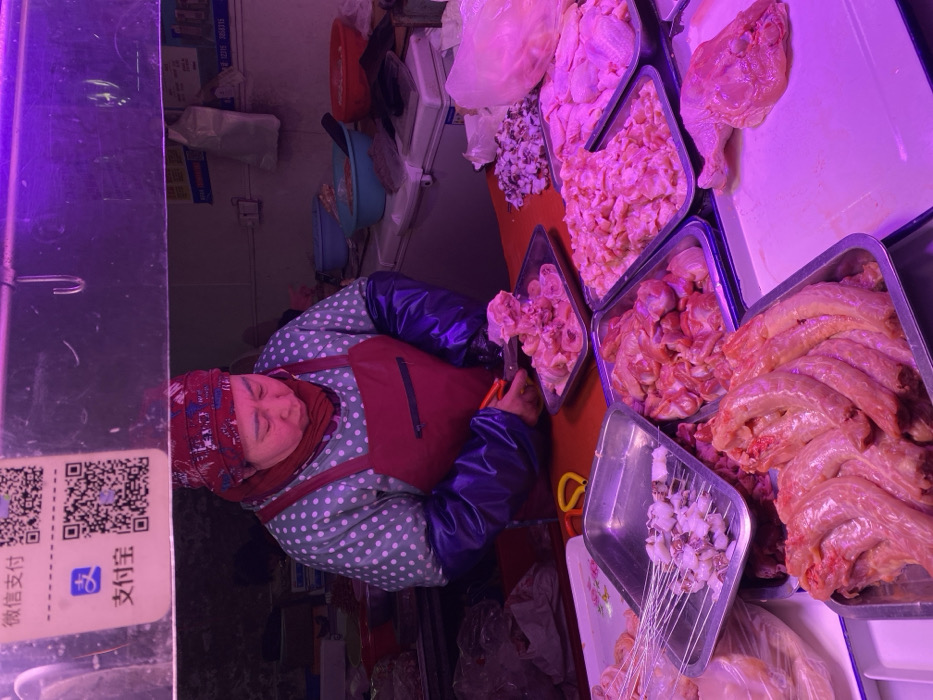 - "In an indoor market stall in Linghe, China, a middle-aged female vendor is actively preparing raw meat under artificial magenta-hued fluorescent lighting" by FM-7sf2h2, licensed under CC BY 4.0
