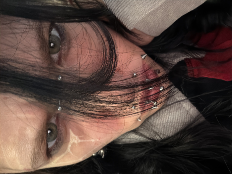 A close-up, downward-angled portrait shot depicts a person with dark hair, partially obscuring the face, gazing directly forward. The person has fair skin and greenish-hazel eyes with dark eyeliner. Multiple facial piercings are visible: a horizontal bar piercing across the bridge of the nose, numerous small stud and hoop piercings around the mouth, two prominent spike-shaped piercings on the lower left cheek, and several small studs along the right cheekbone. A distinct white, branching scar or tattoo is present on the upper left cheek/temple area. A small dangling earring is visible on the left earlobe. The person is wearing a light-colored, possibly ribbed, fabric garment on the right side of the frame, possibly supporting the head, and a darker garment with a hint of red fabric beneath on the lower left. The environment is indistinct and out of focus, suggesting an indoor setting. The scene is located in Busmantsi, Bulgaria.