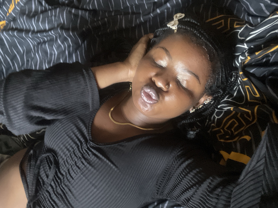 - "An individual with dark skin, dark braided hair, closed eyes, and glossy, slightly parted lips is depicted lying down on dark-colored bedding patterned with white and gold geometric designs" by FM-Ndipm1, licensed under CC BY 4.0