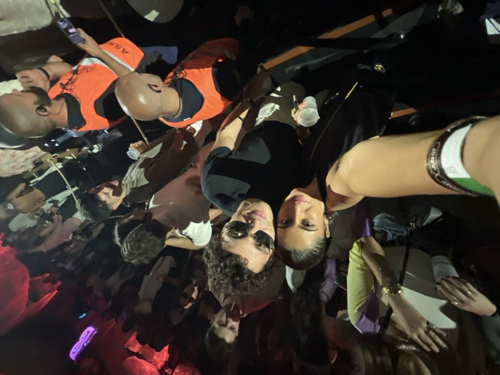 The image was taken at the Bom Jesus do Monte in Braga, Portugal (41.561, -8.431). Two young adults, a man and a woman, are taking a selfie. The woman, dressed in a black tank top, is holding a plastic cup in her left hand and extending her right arm toward the camera. The man is wearing a black striped shirt, sunglasses, and has his left arm around the woman's waist. Behind them is a large crowd of people, many in casual attire, standing in a line that extends into the distance. There are several security guards visible in the foreground wearing orange vests. Some of them are looking down at something on the ground, while others are looking at the crowd. The image was taken in a dimly lit environment, with a large, rocky area in the background, possibly a cave. There are several lights strung above the crowd, casting a warm glow on the scene. The selfie is capturing a moment of fun and camaraderie amidst a large crowd at an event.