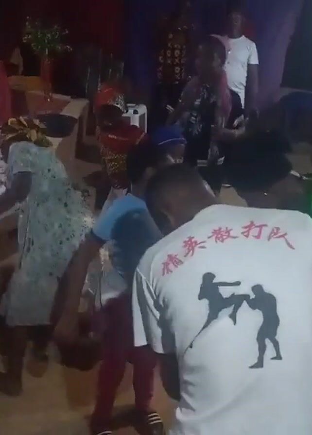 group of people dancing in an indoor setting. The location seems to be a celebration or party with decorations including a pink tablecloth. The dancers include adults and children, and they are moving to music. One person is wearing a white t-shirt with a martial arts design on the back. Another person is wearing a floral patterned dress and a headwrap. The children appear to be excited and are mimicking the movements of the adults. The floor has a tiled pattern.