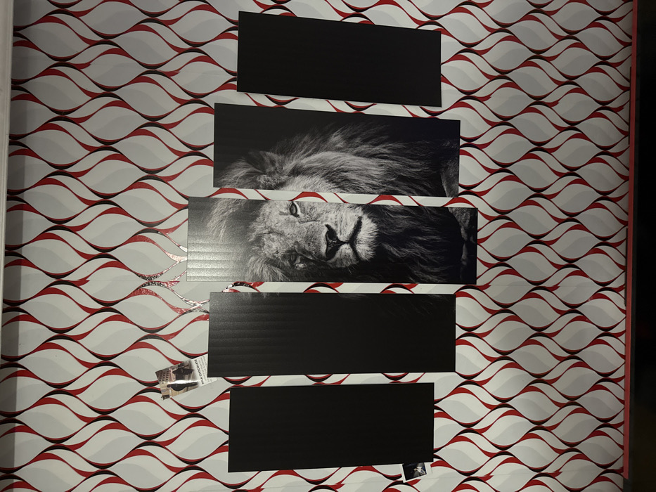 The scene depicts an interior wall located in Cherven Bryag, Bulgaria. The wall is covered in wallpaper featuring a repeating pattern of interlocking wavy or sinuous shapes in red, black, and gray on a white background. Five rectangular panels are mounted horizontally on the wall. The two leftmost panels are solid black. The central two panels form a continuous black and white photographic depiction of a lion's head and upper body, facing forward. The rightmost panel is also solid black. A small, crumpled paper, appearing to be a "MILK CHOCOLATE" wrapper with an image of two figures, is affixed to the wallpaper above the second black panel from the left. A smaller, dark rectangular object, possibly a magnet or sticker with a faint image, is attached to the wall below the leftmost black panel. A thin red trim or skirting board is visible along the bottom edge of the wall.