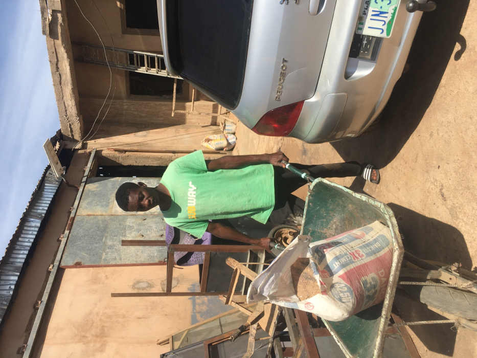 An outdoor scene in Bukuru, Nigeria, depicts a young adult male operating a wheelbarrow on a dirt surface under clear daylight