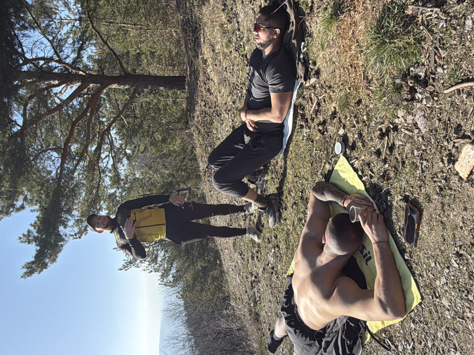 Three adult males are observed in an outdoor, wooded environment on a sunny day, likely in the hills surrounding Kladnitsa, Bulgaria. One male, with a beard and a dark cap, stands in the center-left, wearing a black long-sleeve shirt under a yellow vest, black athletic pants, and white athletic shoes. His right hand is placed on his chest, and his left hand holds sunglasses. Behind him, a large pine tree and a forest are visible, with distant hills and a clear blue sky in the background. Two other males are lying on the ground in the foreground. To the right, a male with a dark beard and sunglasses lies on his back on a white sheet or towel. He wears a dark t-shirt, dark sweatpants, and dark athletic shoes with light brown socks, with his hands clasped over his abdomen. To the left, a shirtless male with a bald head and tattoos on his left forearm lies on his stomach on a yellow towel or mat. He holds a clear glass or cup in his right hand. A dark smartphone with a light-colored case is positioned near his left hand. The ground is dry and uneven, covered with sparse grass, pine needles, and small rocks. A small, circular metallic container is visible near the man lying on the white sheet.