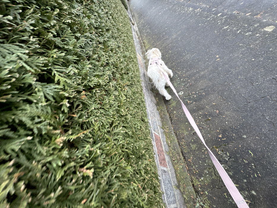 The image depicts an outdoor scene in Echzell, Germany. A small, light-colored dog, consistent with a Maltese or similar breed with shaggy, cream-colored fur, is positioned on a damp, dark paved surface. The dog wears a pink harness, from which a pink leash extends diagonally towards the lower left, indicating a handler off-frame. Its head is directed downwards, appearing to sniff the ground near a stone border. This border comprises two courses of masonry blocks, predominantly grey with some reddish-brown elements in the upper course, supporting a dense, well-trimmed green conifer hedge (Thuja species) that occupies the left portion of the frame. A narrow strip of moist soil and plant debris separates the stone border from the wet, dark asphalt pavement, which also features scattered organic matter.
