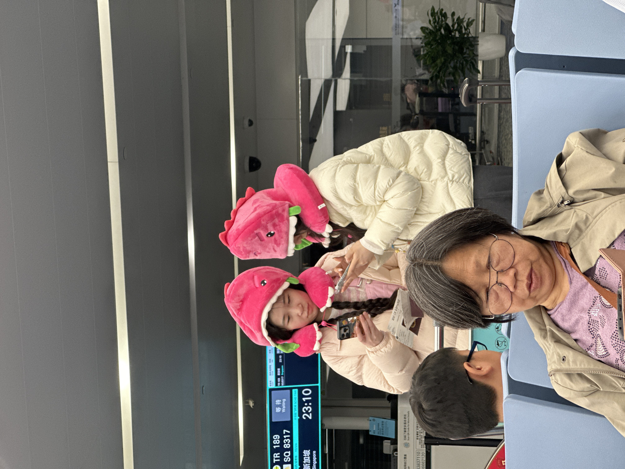 The image depicts an indoor scene within an airport terminal located in Xiaoshan District, China. The time displayed on a digital screen is 23:10. In the midground, two young females are standing. Both wear identical bright pink plush hats shaped like cartoon dinosaurs or dragons, complete with green teeth and eye details; these hats also function as neck pillows. The female on the left wears a light pink puffer jacket and has dark hair in two braids, holding a smartphone in her right hand and documents in her left. The female on the right wears a cream-colored puffer jacket and is also holding a smartphone. In the foreground, an older female is seated in a blue airport chair, facing slightly right with her eyes closed, suggesting rest. She wears round metal-rimmed glasses, a light brown jacket, and a purple patterned top. A young male, visible from the back, is seated behind her. The background features a digital flight information display board showing "TR 189 SQ 8317" to "Singapore (新加坡)" with a status of "Waiting (等待)." Beyond the subjects, a modern airport environment with a glass partition, an overhead security camera, and a potted plant is visible.