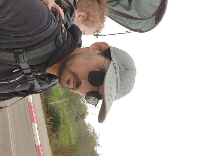 A male individual is depicted from the mid-torso up, facing slightly right and looking towards the camera. He wears a grey baseball cap, dark hexagonal-framed sunglasses, and a dark zippered hooded jacket over a backpack with visible grey straps and buckles. He has a beard. A child with curly reddish-brown hair is partially visible behind him, secured in a grey and dark-colored hiking-style child carrier, with a grey mesh canopy extending above the child's head. The scene is outdoors on what appears to be an overcast day in Rosh HaAyin, Israel. An asphalt road with a red and white painted curb is visible in the foreground to the right. The background features a green grassy area, scattered trees, and a chain-link fence.