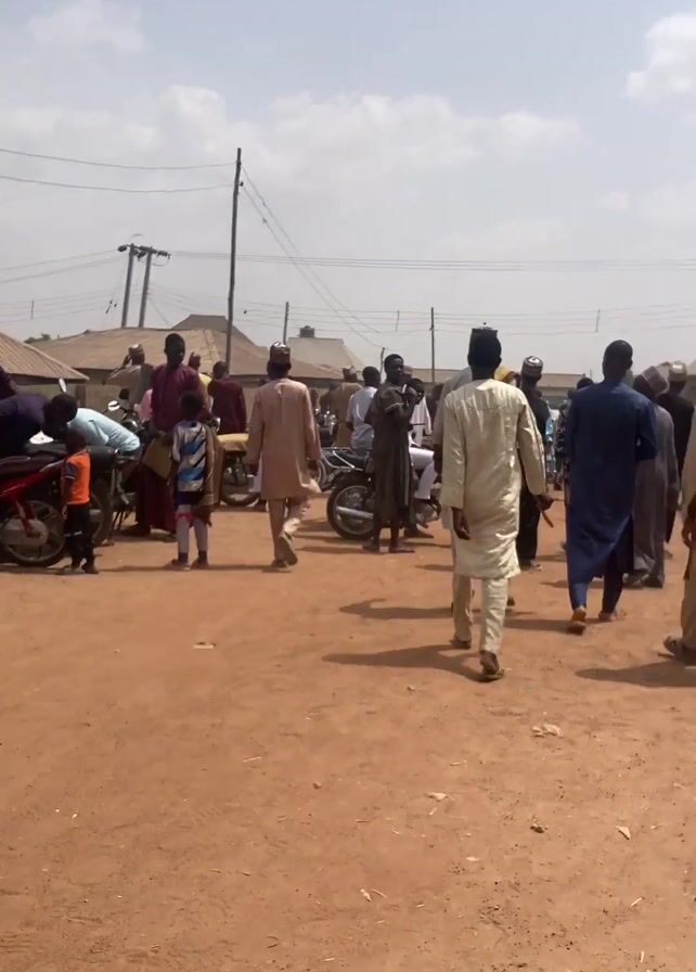 A crowd of people, mostly men, are walking in a dirt road. Most of the men are wearing traditional clothing such as long robes. Some children are present. Some parked motorcycles are visible. There are buildings and power lines in the background. The sky is bright with scattered clouds. The general activity appears to be a community gathering.