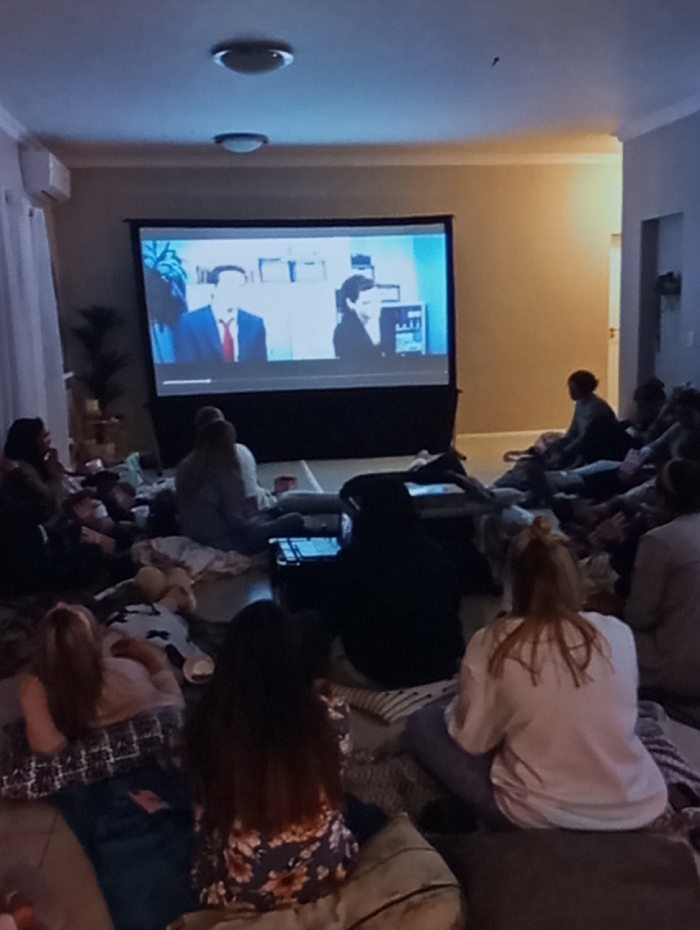 The image depicts an indoor gathering in Aktash, Uzbekistan, where approximately 15 individuals, predominantly female, are seated on cushions and blankets on the floor, watching a projection screen. The large screen displays a scene featuring two individuals: a male in a suit and red tie on the left, and a female in dark attire on the right. The room is dimly lit, with ambient light from the screen illuminating the immediate area. Overhead, two recessed ceiling lights are visible. To the left, a white air conditioning unit is mounted on the wall above closed white curtains, with a dark potted plant partially visible below. Towards the right, an open doorway leads to another room or hallway. In the mid-ground, a laptop is open and illuminated, displaying what appears to be data or text. The individuals are mostly facing the screen, their postures indicating passive viewing.