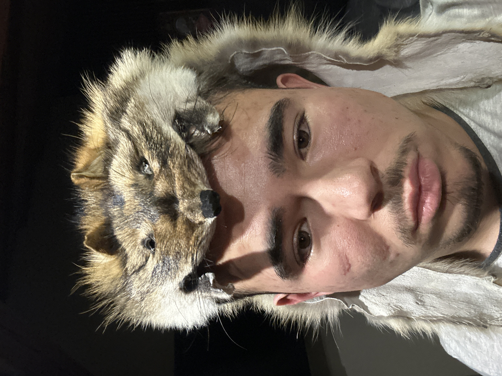 A frontal portrait shot depicts a young adult male in Voluyak, Bulgaria, against a uniformly dark background. The subject has fair skin, dark brown eyes, thick dark eyebrows, and a thin mustache and goatee. A faint reddish scar or mark is visible on his left cheek. He is wearing a light grey t-shirt with a darker neckline. Dominating the upper portion of the frame is a fur hat, crafted from the head and pelt of what appears to be a small canine or vulpine animal, possibly a fox or raccoon. The animal's preserved face, featuring dark eyes and a dark snout, rests on the subject's forehead. The fur displays mottled tones of light brown, tan, and greyish-white, with prominent guard hairs. The white underside of the pelt, including some residual fur, extends down both sides of the subject's head and partially obscures his ears. The subject maintains a direct, neutral gaze towards the viewer. Lighting is direct, illuminating the subject's face and the fur hat.