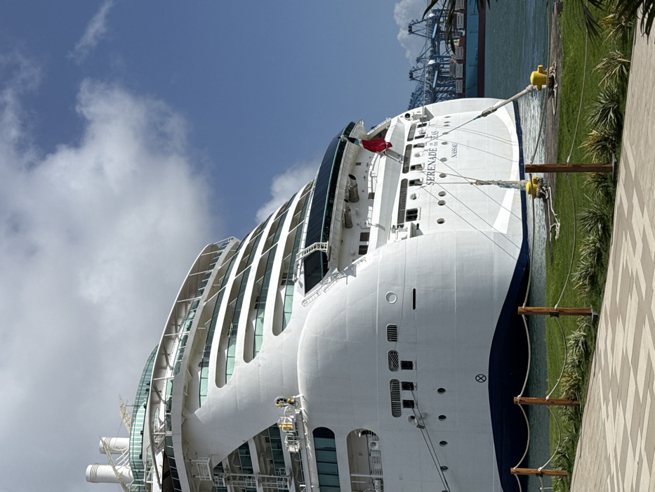 A cruise ship named "Serenade Seas Nassau" is docked along a pier