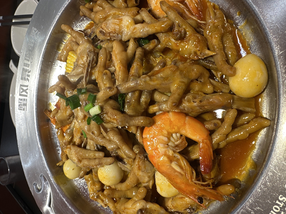 The image displays a close-up, top-down view of a large, steaming metal platter containing a cooked dish, observed within a restaurant in Yiwu, China. The dish primarily consists of numerous braised chicken feet, heavily coated in a thick, glossy, reddish-brown sauce. Interspersed among the chicken feet are several whole, cooked, orange-hued shrimp with intact shells, and multiple peeled, light yellow, spherical quail eggs. Small pieces of yellow corn kernels on the cob are also visible. The dish is garnished with chopped green onions scattered across its surface. The rim of the circular metal platter features engraved Chinese characters, specifically "璧风景", with partially visible English text below it that appears to be "CHA..." and "STONS". The blurred background reveals elements of a dining environment, including a dark table surface, a transparent drinking glass, and white ceramic dishware, consistent with an active meal.