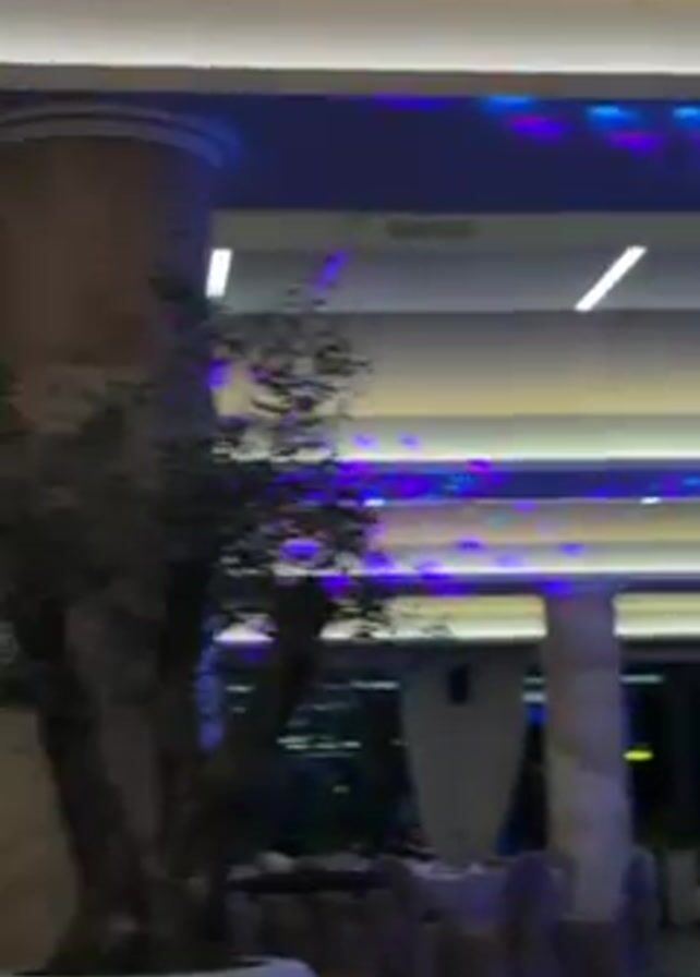 brightly lit indoor event space with people seated at tables. Some people are eating, while others appear to be talking and using their phones. There is a stage area visible, equipped with lighting fixtures. A person dressed in black is standing and gesturing, possibly giving instructions or speaking to someone. The environment appears modern, with sleek design elements and a generally festive atmosphere.
