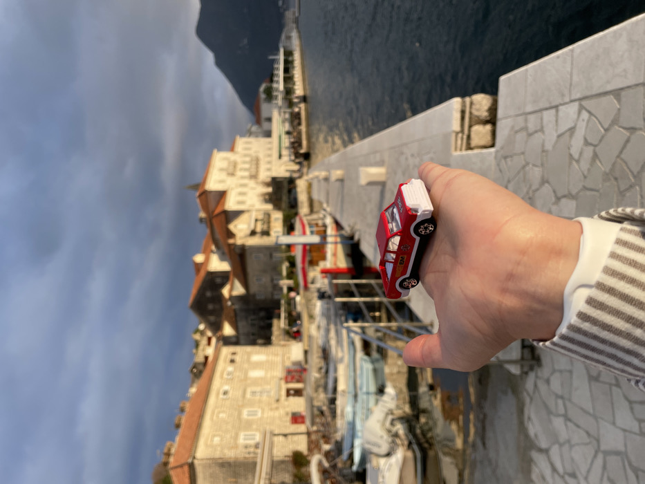 A human hand occupies the lower-center of the frame, holding a miniature red and white toy pick-up truck. The hand, with light skin, is palm-up, supporting the truck which features "FIRE" printed on its side and a white front bumper. The person wears a light-striped sleeve and a white wristband. The background, in Perast, Montenegro, is a blurred but recognizable coastal town scene. A stone quay, constructed from large, light-colored blocks, extends from left to right. Several small boats, some with outboard motors, are moored in the dark water of the bay alongside the quay. Beyond these, a line of traditional stone buildings with orange terracotta roofs rises along the waterfront. These structures are illuminated by warm, directional sunlight, indicating either dawn or dusk. In the far distance to the right, a large, dark mountain dominates the horizon, emerging from the bay. The sky is partially overcast with dark clouds interspersed with brighter areas.